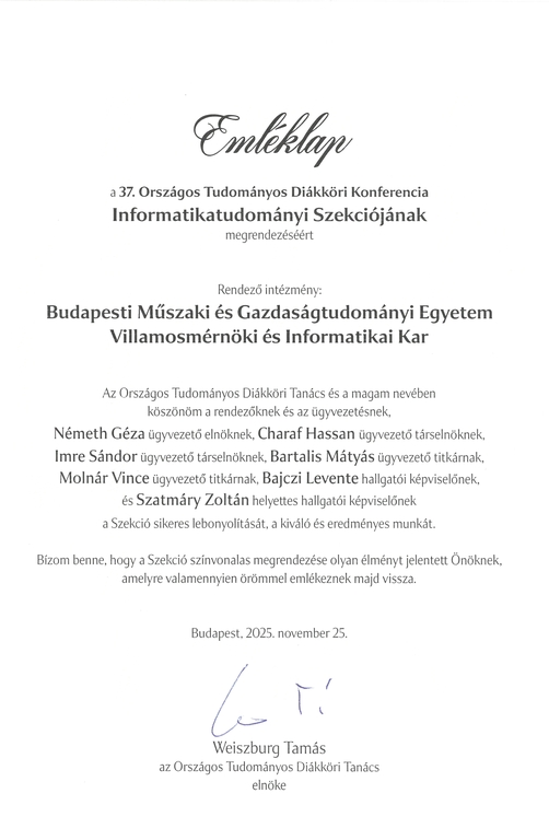 A 37. OTDK Informatikai Szekciójának megszervezéséértemléklapban részesültek a védnökök és főszervezők.